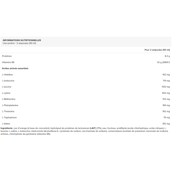 L-leucine (en g) : 27,1 L-isoleucine (en g) : 17,3 L-valine (en g) : 19,6 Arginine (en g): 0 Glutamine (en g) : 0
